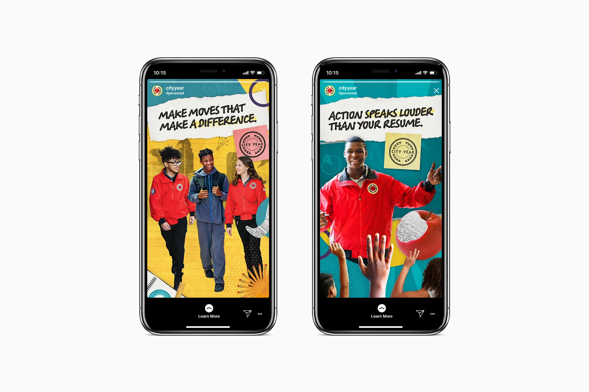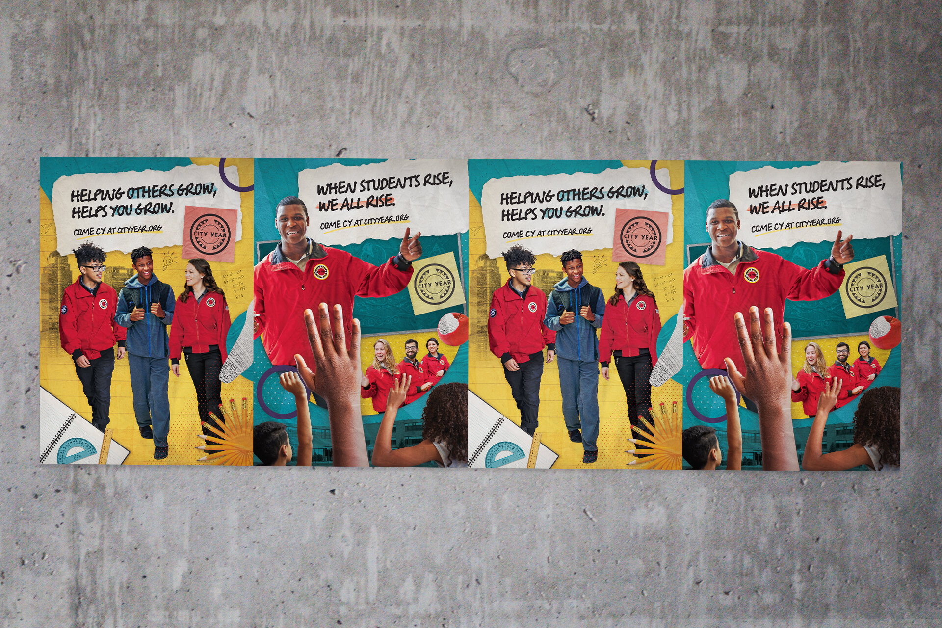 Mixed-media-style collages combine images of City Year Corps Members and school supplies illustrate the new setting and various challenges that will help mold these young adults into leaders in their schools and beyond.